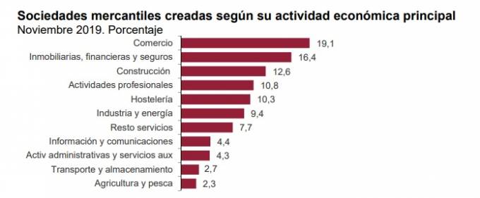 En cuanto a al número de sociedades mercantiles disueltas en noviembre es de 1.982, un 0,5% menos que en el mismo mes de 2018. De éstas, el 81,2% lo hicieron voluntariamente, el 7,8% por fusión y el 11,0% restante por otras causas.