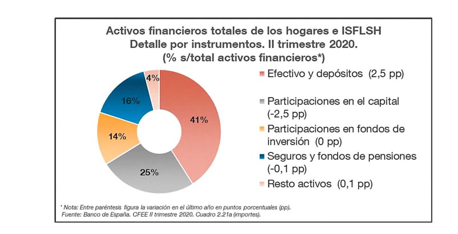 Por componentes, seguros y Fondos de Pensiones acaparan el 16% de los activos financieros de los hogares. El grueso de esos activos se mantiene en efectivo y depósitos (el 41% del total), seguido de participaciones en el capital (25%) y participaciones en fondos de inversión (14%).