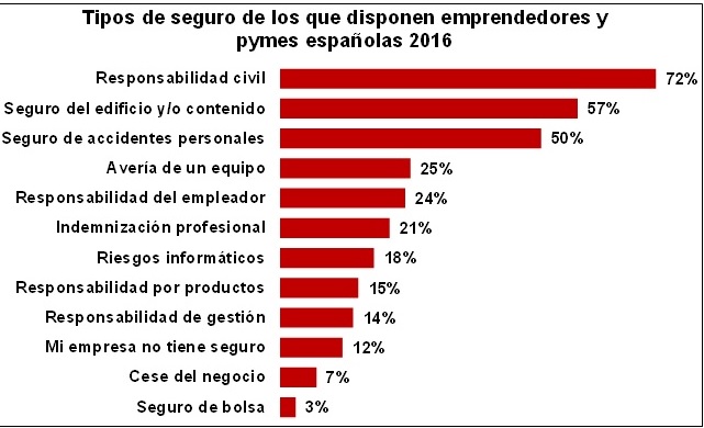El estudio, elaborado entre más de 4.000 pymes y emprendedores de España, Alemania, Reino Unido, Francia, Holanda y EEUU, muestra que entre los emprendedores españoles los seguros más contratados son: RC (72%), el edificio y/o contenido (57%), accidentes personales (50%), avería de equipos (25%) y responsabilidad derivada del empleador (24%). En cambio, solo el 14% dispone de un seguro de responsabilidad de D&O y un 7% de cobertura ante un potencial cese de negocio.