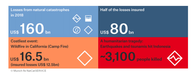 Torsten Jeworrek, miembro del consejo de Munich Re, asegura que "en 2018 se vieron grandes catástrofes naturales con elevadas pérdidas aseguradas. Estas incluyeron fenómenos inusuales de ciclones tropicales severos en EEUU y Japón, mientras que los incendios forestales de otoño devastaron partes de California. Estos masivos incendios forestales parece que están ocurriendo más frecuentemente como resultado del cambio climático. Es necesario urgentemente crear códigos de construcción y uso del suelo para ayudar a prevenir pérdidas. Dada la mayor frecuencia de pérdidas por eventos inusuales y la posible relación entre ellos, las aseguradoras necesitan analizar si los eventos de 2018 ya estaban en el radar de sus modelos o si necesitan realinear sus estrategias de gestión del riesgo y suscripción".