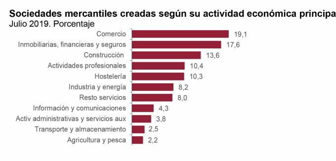 En el pasado mes de julio se crearon 7.820 sociedades mercantiles en España, un 1,6% más que en el mismo mes de 2018, según datos publicados por el INE. Y se disolvieron 1.622, lo que significa un 8,3% más que hace un año. Por sectores, donde más empresas se crearon fue –una vez más– en el Comercio (19,1% del total), por delante del conjunto donde el INE agrupa a empresas inmobiliarias, financieras y seguros, que acapararon el 17,6% de las nuevas empresas. Por su parte, este grupo registró el 7,9% de las disoluciones.