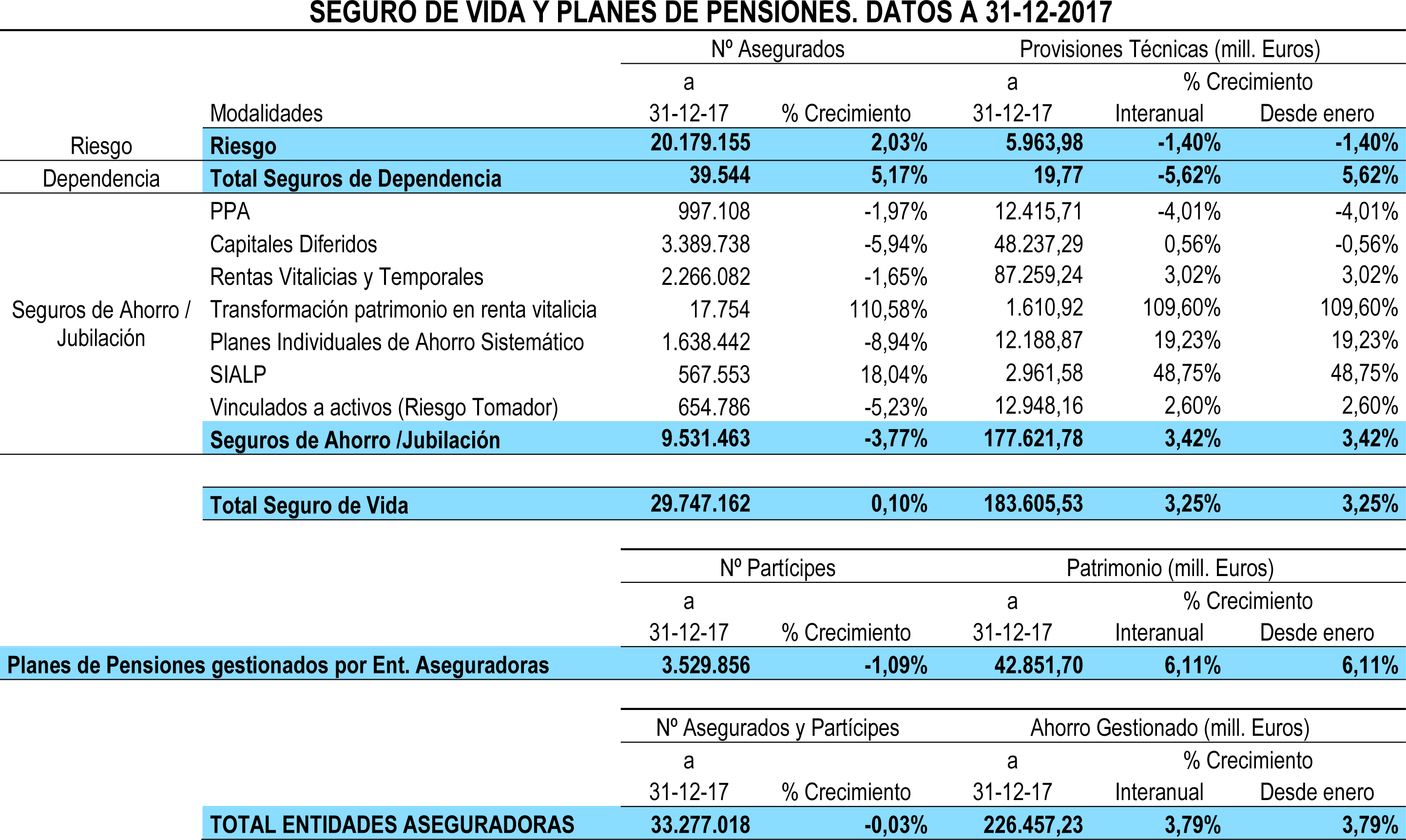 Al acabar 2017, las aseguradoras velaban por 226.457 millones de euros de sus clientes, tras anotar un incremento interanual del 3,79%. De esa cantidad, 183.606 millones corresponden a productos de seguro, un 3,25% más. Los restantes 42.852 millones constituyen el patrimonio de los Planes de Pensiones cuya gestión ha sido encomendada a entidades del sector. Este último importe es un 6,11% superior al anotado el pasado ejercicio por las mismas fechas.