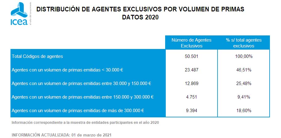 Y de nuevo descendió el número de agentes exclusivos con volúmenes de negocio más bajos. Al término de 2020 eran 12.869 profesionales los que contaban con una cartera de entre 30.000 y 150.000 euros, el 25,82% del conjunto de agentes exclusivos, mientras la cifra de aquellos con una cartera inferior a 30.000 euros fue de 23.587, el 46,51% del total.