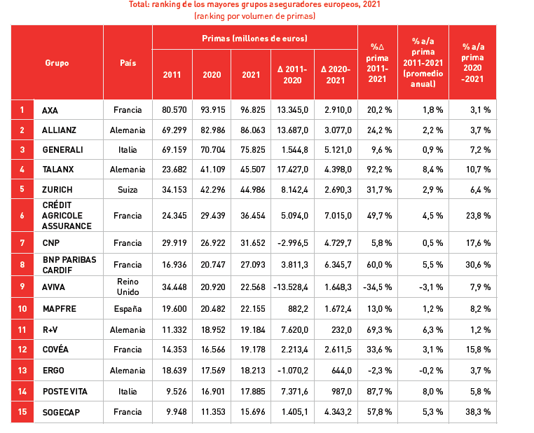 Entre los 15 primeros grupos, hay otro español: BBVA Seguros. Es undécimo tras escalar una posición. En 2021, obtuvo un volumen de primas de 3.099 millones y una cuota de mercado del 2,1%.