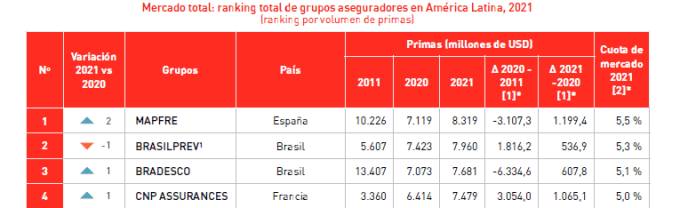 Por primera vez desde el inicio de la serie histórica, Mapfre ha pasado en 2021 a liderar el ranking total de grupos aseguradores de Latinoamérica. Y lo ha conseguido gracias a los 8.319 millones de dólares recaudados en primas en la región, que le ha valido para alcanzar una cuota de mercado del 5,5%.