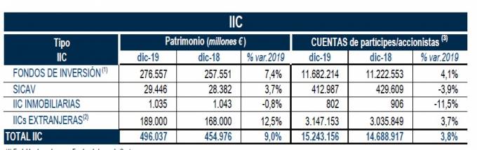 En cuanto al patrimonio de los Fondos de Inversión colectiva (Fondos y Sociedades) experimentó en diciembre un crecimiento de 3.425 millones de euros y se situó en 496.037 millones, lo que supone un aumento del 0,7% con respecto a noviembre.