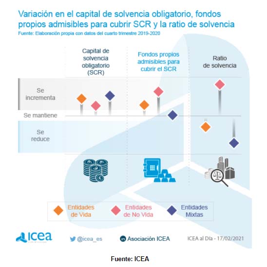 Las entidades especializadas en el negocio de No Vida han mejorado, en líneas generales, su ratio de solvencia a lo largo de 2020. Según los resultados a fecha de diciembre, y después del análisis de ICEA, la firma concluye que estas entidades han aumentado los fondos propios permitidos para cubrir el SCR (requerimientos de capital de solvencia obligatorio) en mayor medida que el incremento en el requerimiento de capital, "lo que provoca una mejora en la ratio de solvencia".