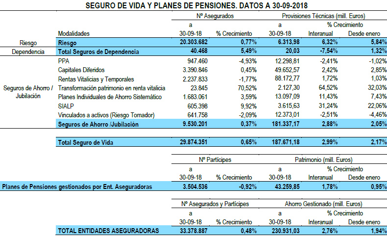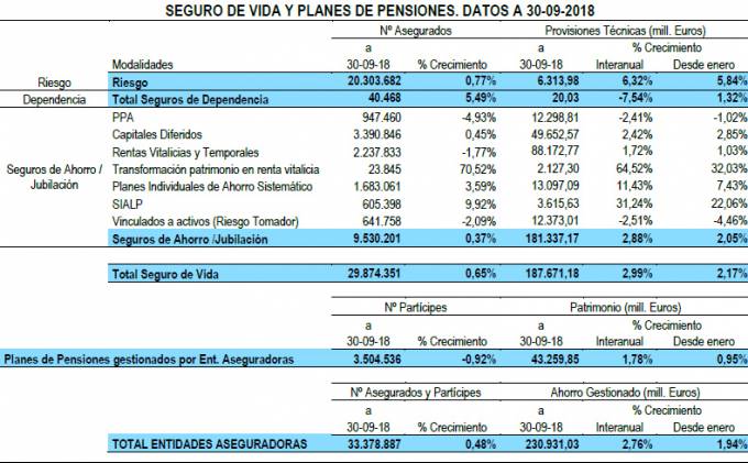 Al acabar el tercer trimestre, las aseguradoras velaban por 230.931 millones de sus clientes, tras anotar un incremento interanual del 2,76%. De esa cantidad, 187.671 millones corresponden a productos de seguro, un 2,99% más. Los restantes 43.260 millones constituyen el patrimonio de los Planes de Pensiones cuya gestión ha sido encomendada a entidades del sector. Este último importe es un 1,78% superior al anotado el pasado ejercicio por las mismas fechas.