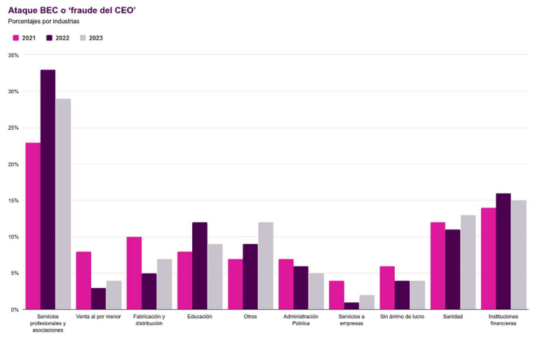 Por el contrario, el fraude del CEO (Business email compromise - BEC, en inglés) aumentó un 18% en términos interanuales en todos los sectores, volviendo así a niveles observados en 2020 y 2021. Los servicios profesionales siguieron experimentando el mayor número de incidentes (un 5% más que el año anterior) mientras que el comercio minorista y los servicios empresariales mostraron una mejora.