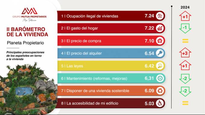 El II Barómetro de la Vivienda 'Planeta Propietario' elaborado por el Grupo Mutua Propietarios evidencia que las principales preocupaciones de los españoles en materia de vivienda que más han subido son la subida del precio del alquiler, la ocupación ilegal y las 'leyes en torno a la vivienda'. En el ranking baja a la segunda posición los gastos asociados al hogar, mientras que el 'precio de compra' mantiene su posición.