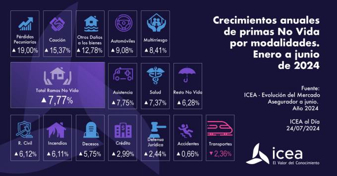 Los datos de ICEA confirman la evolución del sector al cierre de los seis primeros meses del año y, atendiendo a las modalidades de No Vida, hubo 3 que registraron crecimientos por encima del 10%. En primer lugar, Pérdidas Pecuniarias mostró una subida del 19%, por delante de Caución, con un 15,37%, y Otros Daños a los Bienes, con un 12,78%. Por detrás de ellas aparecen Automóviles (+9,08%) y Multirriesgo (+8,41%).
