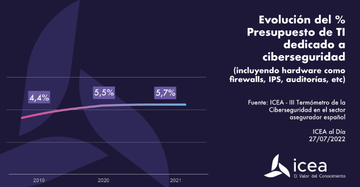El presupuesto dedicado a ciberseguridad por parte de las compañías de seguros ha incrementado en los últimos años. Según los datos de ICEA, éste ha pasado del 4,4% en 2019 al 5,7% en 2021, y con una pandemia de por medio. En el presente informe 'III Termómetro de la ciberseguridad en el sector asegurador español' se señala que 3 de cada 10 de las entidades consultadas dedican un 10% o más de su presupuesto total de TI a la ciberseguridad.