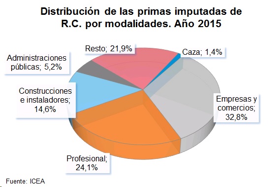 El ramo de RC está compuesto a su vez por diferentes modalidades, de las que la correspondiente a empresas y comercios representa el 32,8% de las primas y el 14,2% de las pólizas, seguido por la de profesionales (24,1% de las primas y 5,8% de las pólizas) y la de construcción e instaladores, con el 14,6% de las primas y el 9,7% de las pólizas.