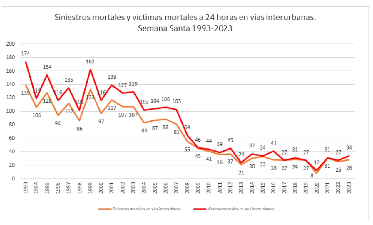 34 personas han fallecido en las carreteras españolas durante la Semana Santa, 7 más que el año anterior, en los 28 siniestros mortales de tráfico que se han producido en vías interurbanas entre las 15:00 horas del viernes 31 de marzo hasta la medianoche del lunes 11 de abril. Una cifra siempre elevada pero que se mantiene relativamente estable desde 2014, según los datos provisionales publicados por la DGT.