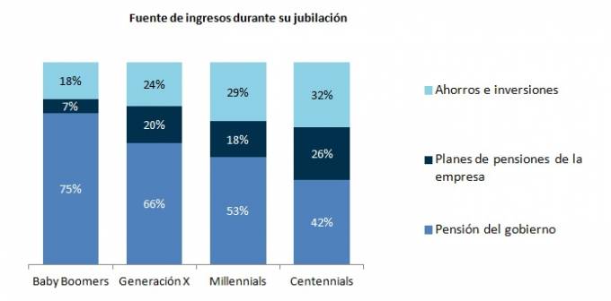 Aunque todas las generaciones apuntan a la pensión pública como principal fuente de ingresos durante su jubilación, en cada una de ellas tiene un protagonismo distinto. Los baby boomers creen que la pensión supondrá un 75% del total de sus ingresos, frente a los centennials, cuya perspectiva es que la pensión pública suponga poco más del 40% de sus ingresos durante la jubilación. Los millennials y generación X se sitúan entre las dos generaciones anteriores, con un 53% y 66%, respectivamente.