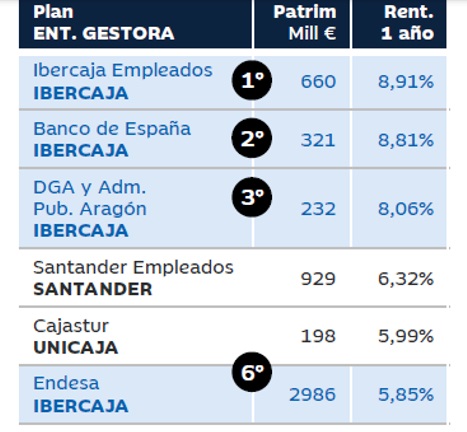El primer puesto lo ocupa el Plan de Empleados de Ibercaja que alcanza un 8,91% de rentabilidad y cuenta con un patrimonio de 660 millones de euros, seguido por el Plan de Empleados del Banco de España con un 8,81% de rentabilidad para sus 321 millones de patrimonio. En 3ª posición el Plan de la Diputación General de Aragón y Administraciones Públicas acumula 232 millones con una rentabilidad anual de algo más del 8%.