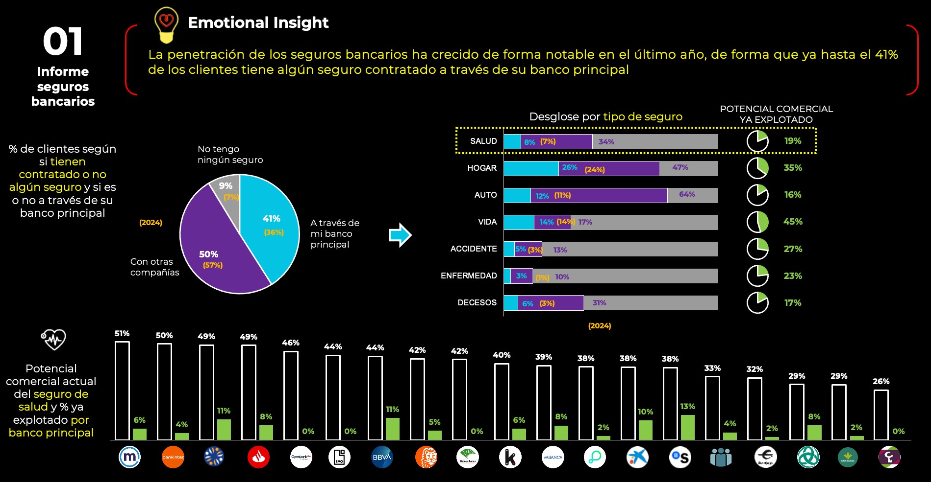 Aun así, los datos muestran que el potencial de crecimiento sigue siendo alto, ya que en todos los ramos el porcentaje de seguros que los clientes contratan fuera del ecosistema bancario es superior a aquellos que se contratan con o a través del banco principal.