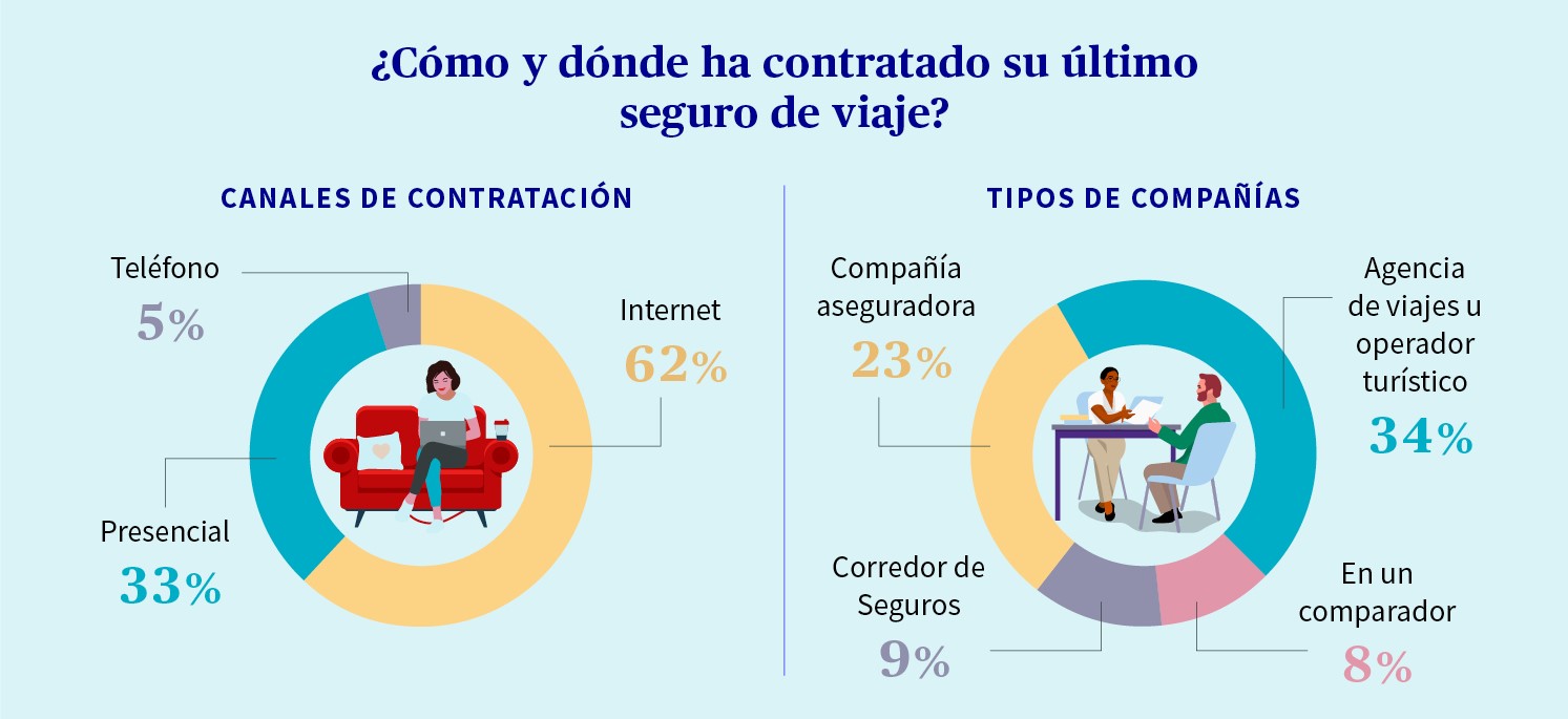 En cuanto al canal por el que suelen contratar los seguros los viajeros españoles, el informe recoge que el canal online es el preferido (62%) frente al 33% que se decantó por la contratación presencial. Un 5% recurrió a una llamada telefónica. Asimismo, también se hace eco el estudio que el 34% de los viajeros optó por una agencia de viajes u operador turístico y un 23% se decantó por hacerlo directamente en una aseguradora. A continuación, se sitúan las aerolíneas (10%), los corredores de seguros (9%) y los comparadores (8%).