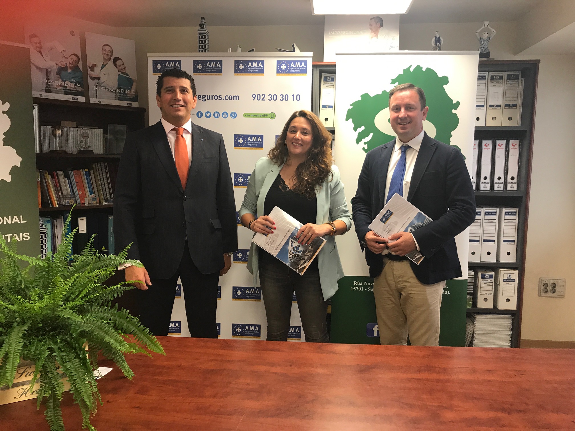 Andrea Pardo Rivera, presidenta del Colegio y Javier Sande, director territorial de A.M.A. en Galicia, han rubricado el seguro en un acto celebrado en la sede colegial. A la firma también asistió el delegado de la Mutua en Santiago de Compostela, David Vázquez.