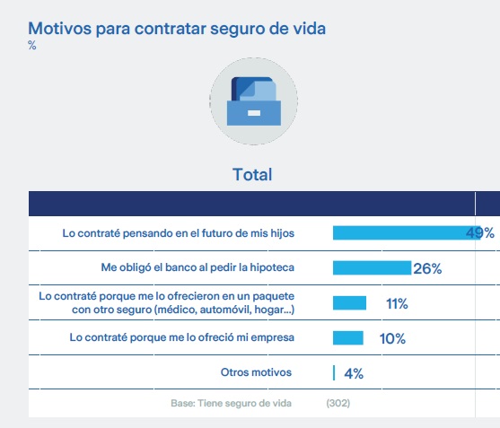 Un 30% de los españoles cuentan con seguro de Vida, según datos del estudio 'Preocupaciones y retos de la crianza actual en España', realizado por Kantar y en colaboración con el centro de formación en habilidades La Granja y Zurich. De éstos, el 49% lo ha contratado pensando en el futuro de sus hijos. Otras motivaciones que llevan a contratar este producto son para un 26% de españoles "que me obliga el banco al pedir la hipoteca", seguido de porque va incluido en un paquete junto al seguro de Hogar, Autos… o porque lo ofrece la empresa.