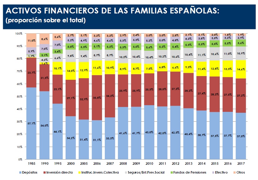 En la estructura del ahorro financiero de las familias españolas los depósitos y el efectivo sigue siendo los que más peso tiene con un 39,9%, aunque es 1 punto porcentual menos que el año 2016. Los seguros aportan un 10,9% mientras que los Fondos de Pensiones un 5,6%.