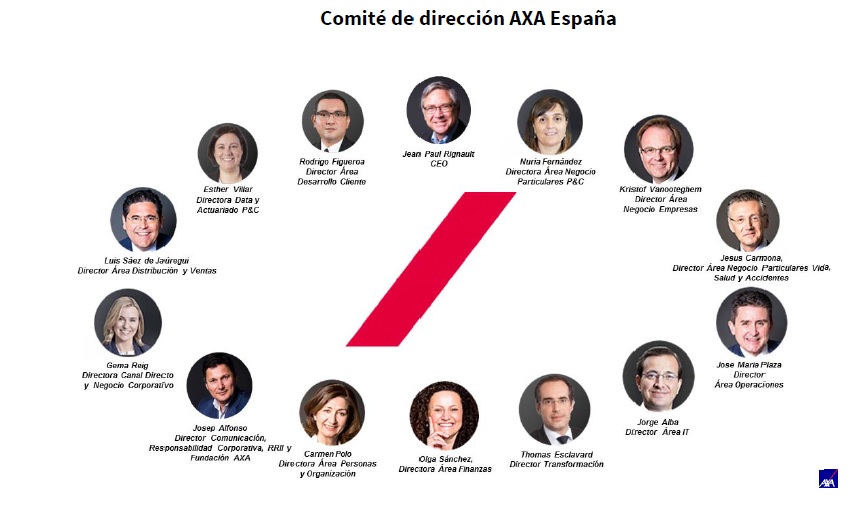 AXA España estrenará estructura directiva a partir del 1 de enero de 2018. Al comité de dirección se incorporarán cinco nuevos miembros: Rodrigo Figueroa, nuevo director de Desarrollo Cliente; Gema Reig, directora de Canal Digital y Negocio Corportivo; la matemática Esther Villar, nueva directora de Data y Actuario P&C; el ingeniero Thomas Esclavard, quien se encargará de la dirección de Transformación con el objetivo de asegurar la implantación y aceleración del plan global, reforzando las capacidades de ejecución y metodologías colaborativas y ágiles en la gestión de proyectos y programas; y Josep Alfonso, director de comunicación, Responsabilidad Corporativa y Relaciones Institucionales y director de fundación AXA.
