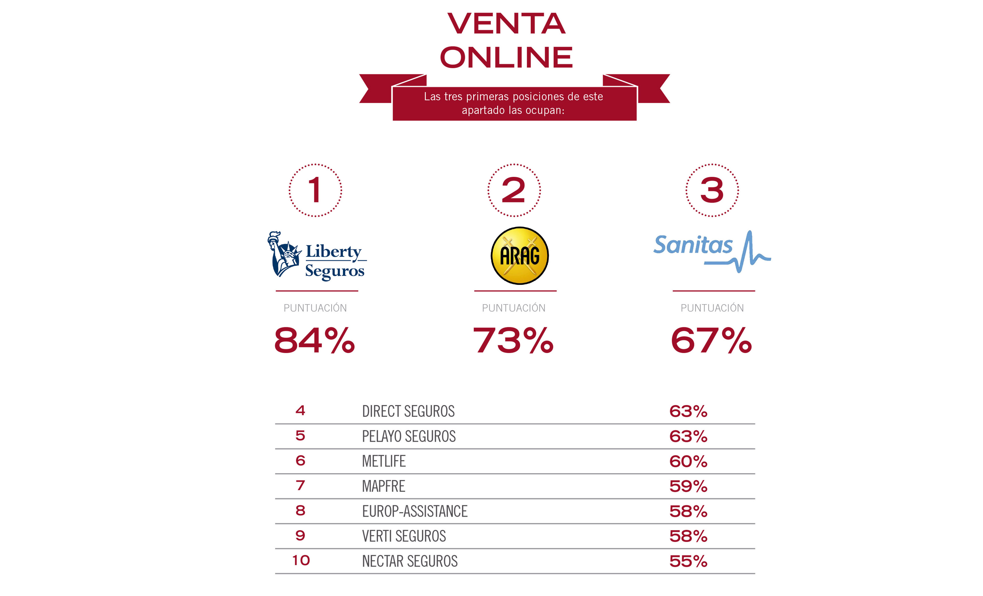 Liberty es la aseguradora que ofrece mejor servicio de contratación online, seguida de Arag y Sanitas. En lo que se refiere a solicitar presupuestos, la conclusión es algo mejor y actualmente un 72,7% de las aseguradoras ya ofrecen este servicio.