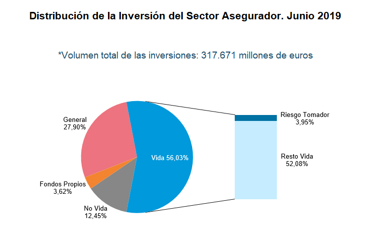 El sector asegurador español contaba con 317.671 millones de euros en inversiones a final del primer semestre de este año. Según los datos de ICEA el 56,03% de esas inversiones corresponden al negocio de Vida; de ellas, casi el 3,95% son con riesgo al tomador. Al segmento general corresponde el 27,9% de las inversiones, al negocio de No Vida el 12,45% y los Fondos Propios el 3,62%.