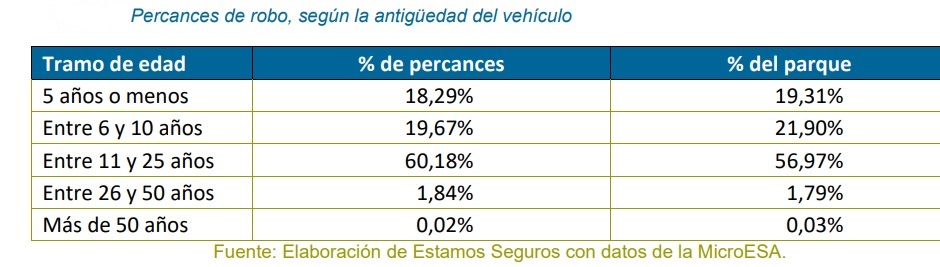 La incidencia de los robos entre los llamados "vehículos viejos" es superior a su peso relativo en el conjunto del parque móvil nacional (57%). Los vehículos más jóvenes, aquellos con menos de cinco años desde su matriculación, sufren un 18% de los robos. Esta magnitud es algo inferior a su representatividad (19%) entre todos los vehículos del país. Sobre este buen dato inciden, como es lógico, las mejoras en sistemas antirrobo que introducen los fabricantes en los nuevos más recientes