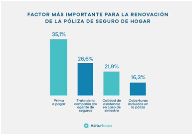 Asitur Focus, el Observatorio de siniestros de Asitur, ha analizado el mercado del seguro de Hogar. Entre las principales conclusiones, se observa una satisfacción general con la prima del seguro: el 65,5% de los asegurados consideran adecuado el precio de su seguro respecto de las coberturas. Uno de cada cuatro cree que la prima de su seguro es cara, mientras que el 4,4% estima que tiene un seguro barato. La prima del seguro se destaca como el factor de más peso en el momento de la renovación de la póliza, el 35,1% de los encuestados; seguido con un 26,6% que considera más importante el trato que la compañía o el mediador dispensa al asegurado; y el 21,9% que piensa que el factor más importante es la calidad del servicio en caso de siniestro.