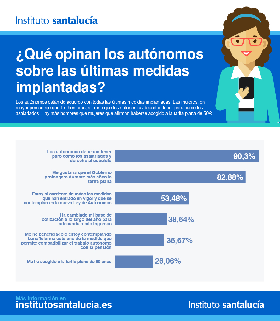 Para José Manuel Jiménez, director del Instituto Santalucía, "sin duda es una buena noticia que se estén introduciendo cambios que ayuden a mejorar la situación del colectivo de autónomos y animen e impulsen el emprendimiento. Es también labor de todos seguir potenciando la información y la educación financiera de los trabajadores, algo fundamental para moverse en el mundo laboral. De hecho, resulta llamativo que solamente el 53,5% de los autónomos afirma estar al corriente de todas las medidas que han entrado en vigor en el último año".