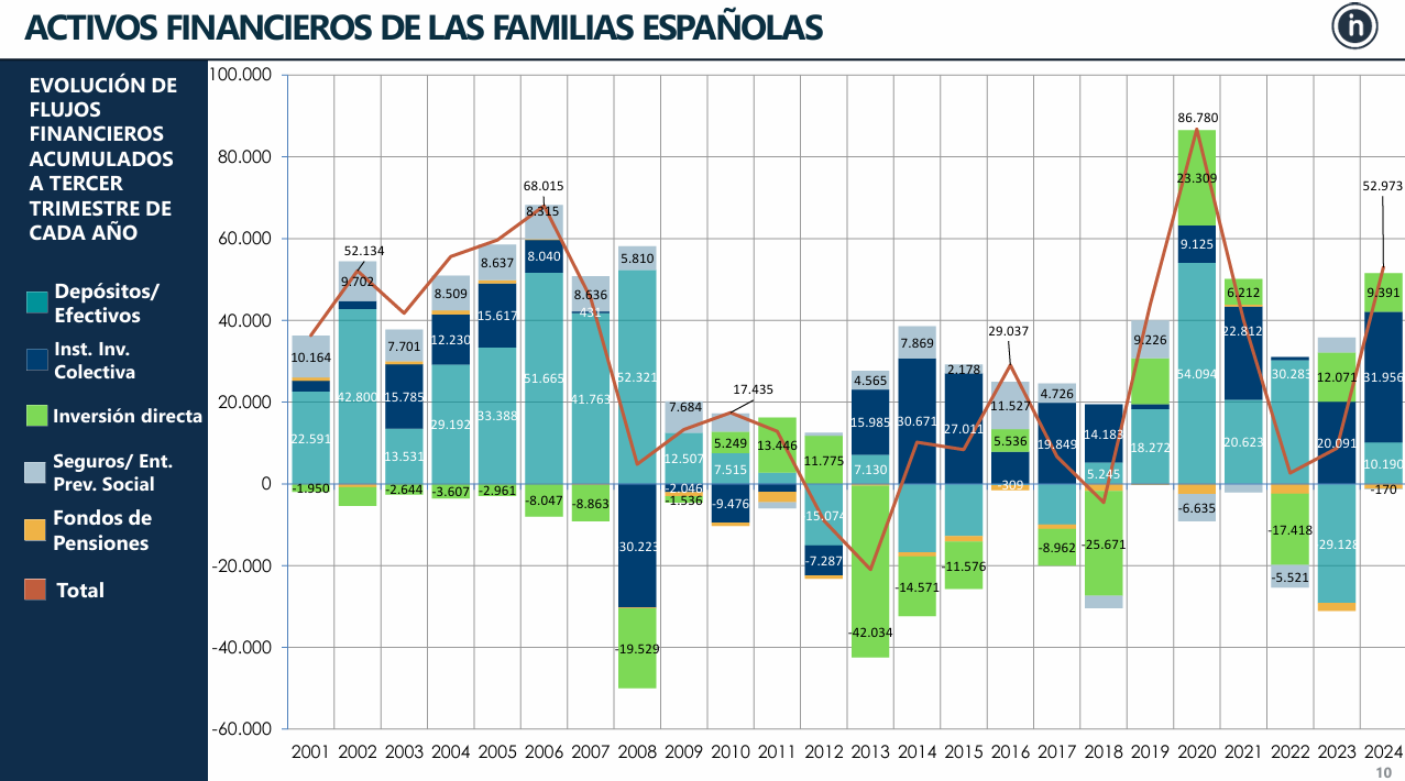 Por otra parte, en este último trimestre los Fondos de Inversión destacaron como el único activo financiero que registró flujos de entrada positivos. Este canal de ahorro logró canalizar 11.437 millones de los hogares españoles. Asimismo, la adquisición de renta fija por los hogares registró las primeras desinversiones netas desde el primer trimestre de 2022 hasta un total de 725 millones, según el informe del Banco de España.