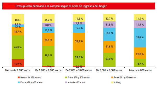 En los dos últimos años los hogares han incrementado el gasto en alimentación. El presupuesto que dedican hoy 7 de cada 10 españoles a hacer la compra se encuentra entre los 150 y 450 euros mensuales, lo que supone un ligero incremento con respecto a 2015. Dicha tendencia también se refleja en que actualmente las familias invierten más tiempo en realizar la compra y consumen productos frescos más frecuentemente. Casi 4 de cada 10 familias (38%) suele comprar verduras y frutas a diario o tres o cuatro veces por semana, cifra que pone de manifiesto que, por lo general, buscan alimentos más saludables (92,6%).