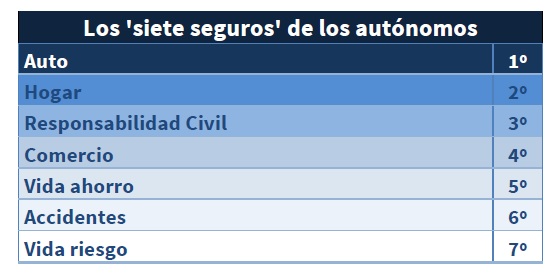 Según un estudio de AXA sobre más de 300.000 datos analizados, el 38% de los autónomos cuenta con seguro de Auto; el 17% con un seguro de Hogar; un 8% tiene seguro de RC y un 7% de Comercio. Finalmente, los seguros de Salud, Vida y de Caución son los que menos contratan los autónomos