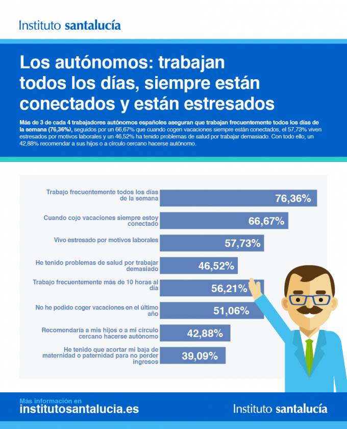 Todas estas circunstancias hacen que el 58% de los autónomos afirme vivir estresado por motivos laborales. Además, hasta un 46% de los trabajadores por cuenta propia sostiene que ha tenido problemas de salud por trabajar demasiado.