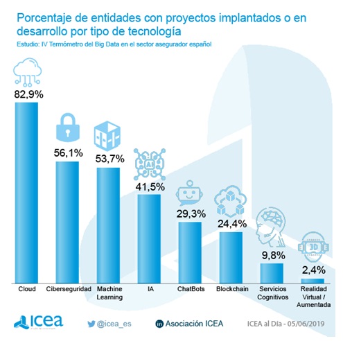 Las nuevas tecnologías ya están ampliamente consolidadas en las aseguradoras. El Cloud está implantado o en desarrollo por el 83% de las aseguradoras, según datos de ICEA. También trabajan ya d forma muy amplia con Machine learning o la Inteligencia artificial. Sin embargo, el Blockchain o Realidad virtual o aumentada, son aún minoritarias.