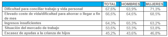 Cada año nacen menos niños en España y el índice de fecundidad se sitúa ya en el 1,23, el más bajo desde 2001. Pero, según se extrae de la 'III Encuesta sobre jubilación y hábitos de ahorro de los españoles' realizada por el Instituto Santalucía, al 82,8% de los españoles le gustaría tener más hijos de los que tiene o tendrá. Sin embargo, no pueden por las siguientes causas: dificultad para conciliar trabajo y vida personal, como señalan el 67,6% de los entrevistados; elevado coste de vida y/o dificultad para ahorrar o llegar a fin de mes (66,6%) y falta de suficientes ingresos (64,3%).