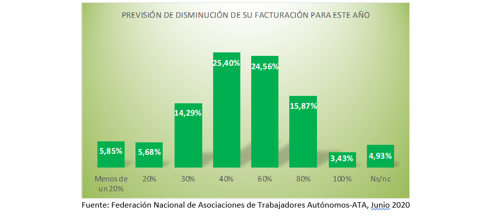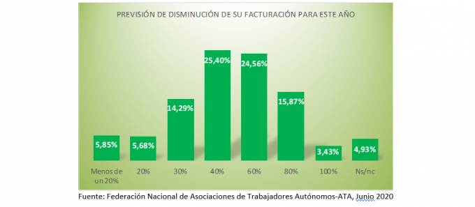 Una nueva encuesta de ATA sitúa en un 89,8% los autónomos que este ejercicio verán caer su facturación. Para el 69,3%, la caída será superior al 40%. La actual situación de "crisis sanitaria vivida desde el pasado mes de marzo ha abierto paso a una crisis económica sin precedentes", según ATA, que sitúa casi en un 90% el porcentaje de autónomos que ya han vuelto a la actividad tras el parón obligado por la pandemia, pero el 10,4% que aún no lo hacho supone que cerca de 320.000 autónomos sigan parados y sin ingresos, "en una situación realmente complicada". Entre aquellos que ya tienen su actividad en activo, solo un 12,1% afirma que funciona al 100%.