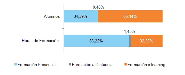 En cuanto a las horas de formación, las cifras se invierten y el 66,2% de las horas se realizan en los cursos presenciales y el 33,33 en los e-learning.