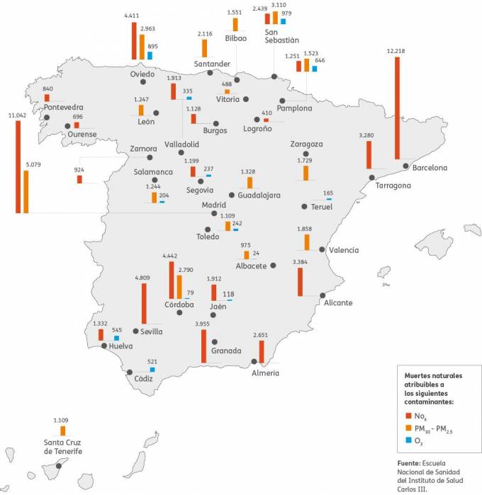 Asimismo, el estudio también pone énfasis en el cuantioso gasto económico que suponen los costes sanitarios en que repercuten la contaminación. Y es que, según un estudio del Banco Mundial referenciado en el documento, combatir los efectos de la polución en la salud de las personas representa para España un esfuerzo de más de 35.000 millones de euros; es decir, cercano al 3,5% del PIB.