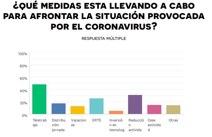 En cuanto a las medidas que tendrán que adoptar las pymes para hacer frente a esta situación, casi un 70% tiene previsto solicitar financiación. En relación a cómo están sorteando este estado de alarma, casi un 50% está apostando por el teletrabajo, un 31% ha tenido que reducir obligatoriamente su actividad y un 25% ha tenido que realizar un ERTE. El lado más negativo es que un 15% teme que tendrá que cesar la actividad.