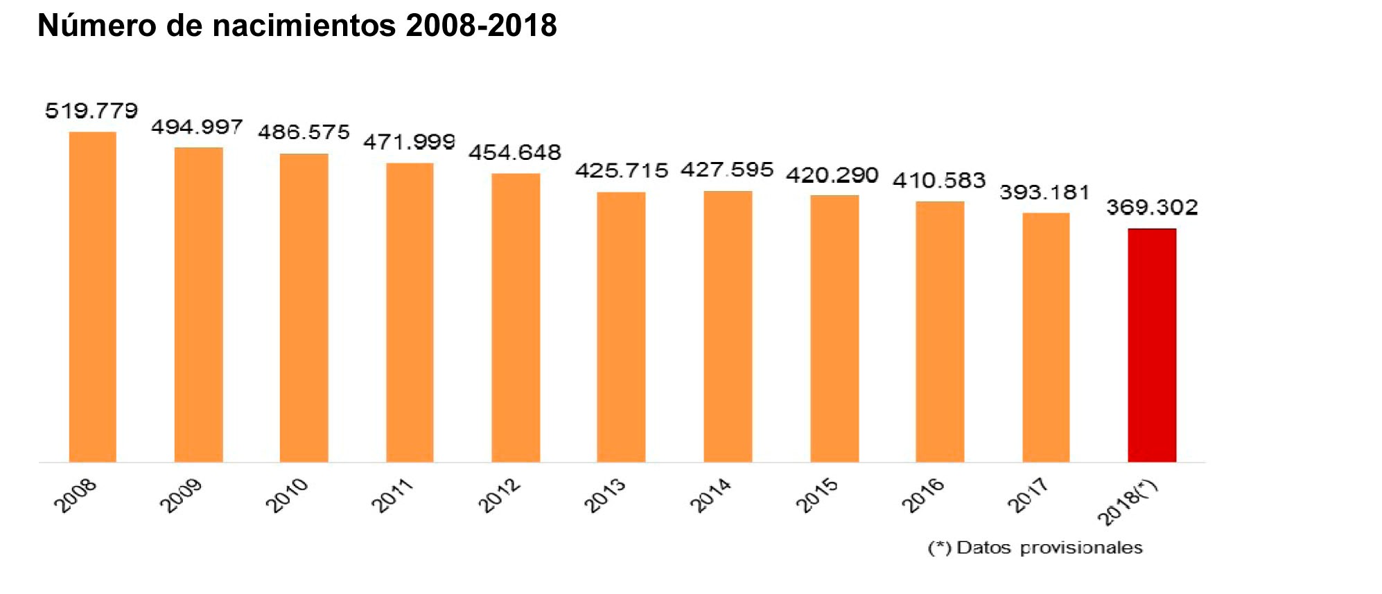 En 2018, se registraron en España 369.302 nacimientos, lo que significa un descenso del 6,1% respecto al año anterior y que se traduce en 23.879 nacimientos menos, según datos provisionales publicados por el INE. Continúa así la tendencia a la baja que se está experimentando en la última década, excepto en 2014. Y es que, desde 2008, el número de nacimientos ha caído nada menos que un 29%.
