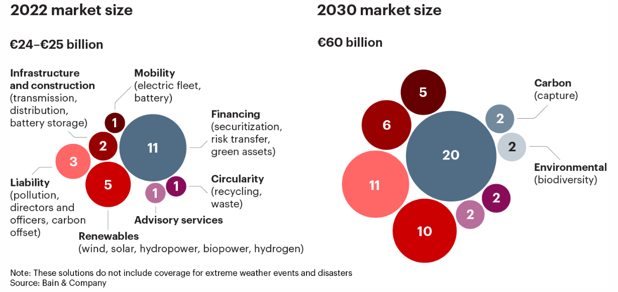 Bain & Company estima que las soluciones aseguradoras vinculadas de alguna manera con el clima van a experimentar un fuerte repunte en los próximos años. En concreto, la consultora calcula que este negocio puede más que duplicarse de aquí a 2030, pasando de unos ingresos por primas de entre 24.000 y 25.000 millones de euros a nivel mundial a 60.000 millones de euros.