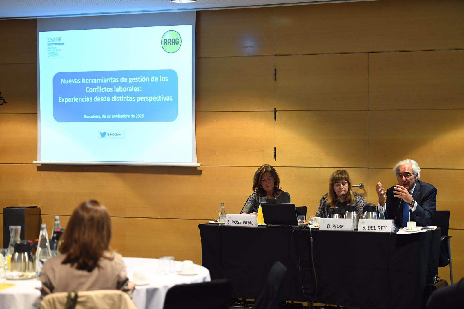 En la mesa participaron también Sara Pose Vidal, magistrada de la Sala de lo Social del Tribunal Superior de Justicia de Cataluña y Salvador del Rey, catedrático de Derecho del Trabajo y de la Seguridad Social de la escuela de negocios. La primera expuso los resultados del plan piloto de mediación intrajudicial social en los Juzgados de lo Social de Barcelona. Indicó que de los conflictos laborales que optan por una solución negociada el 87% finaliza con acuerdo; reflejo también que cuando se conoce el servicio funciona y gusta.