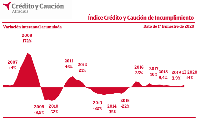 Los niveles de impago comercial crecieron un 14% en España al cierre del primer trimestre, según se extrae del Índice Crédito y Caución de Incumplimiento. De cara a los siguientes trimestres de 2020, la aseguradora advierte de que este indicador estará muy condicionado por la duración e intensidad de la pandemia del Covid-19, su impacto sobre los flujos de caja, las cadenas de producción y la actividad comercial y los efectos de las medidas extraordinarias de acceso a la liquidez del tejido empresarial.