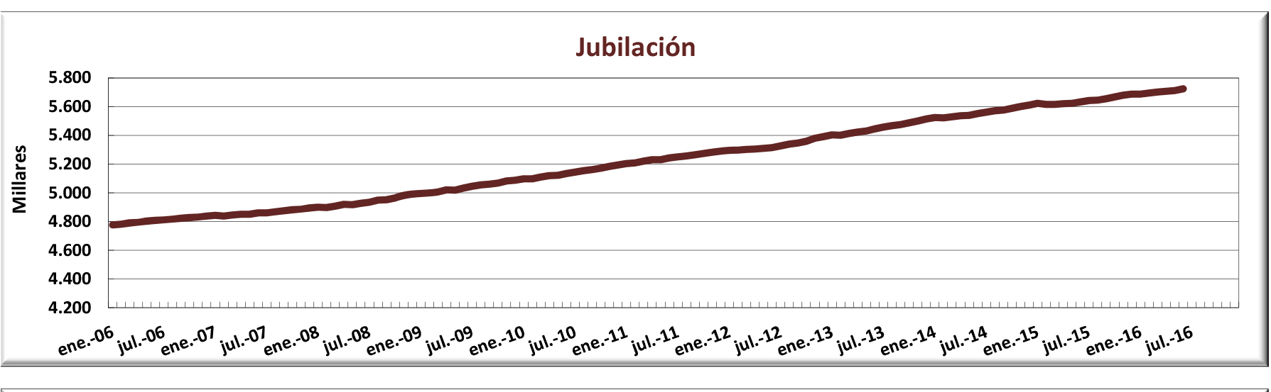 En cuanto a las pensiones de jubilación, la media está en 1.042 euros, un 2,10% más que el año anterior. A junio de 2016 ya son 5.724.764 los pensionistas españoles, un incremento constante desde el año 2006.