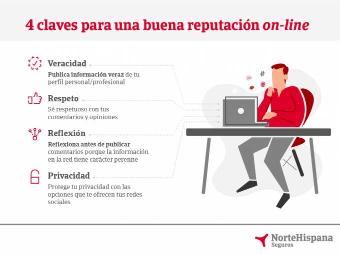 La compañía señala 4 aspectos básicos que hay que tener en cuenta para obtener una buena reputación on-line. En primer lugar indica que la información de una persona en Internet debe ser veraz. Este aspecto es muy relevante desde la perspectiva del ámbito laboral, ya que cada vez más empresas recurren a las RRSS para buscar candidatos a un puesto de trabajo o para contrastar y corroborar los datos que se publican en su CV. Proporcionar información falsa sobre la trayectoria o perfil laboral puede suponer la pérdida de credibilidad y de confianza. Incide en la importancia de la educación. Cualquier comentario que se publique en RRSS, foros o reseñas debe realizarse desde el respeto y manteniendo siempre las formas. Además, hay que tener en consideración que las opiniones y reseñas que un usuario publica en la red pueden contribuir a reforzar su reputación, pero también pueden provocar el efecto contrario, especialmente si el comentario es falso o inapropiado.