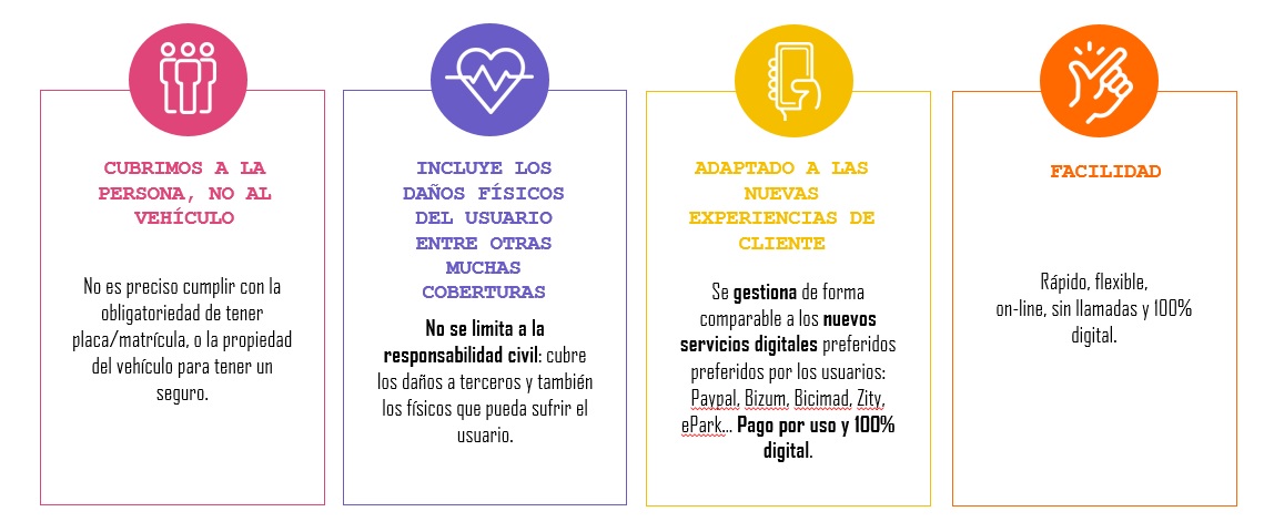 Entre las novedades que aportan, no solo cubre los daños causados a terceros, sino que también se hace cargo de los daños físicos sufridos por el propio usuario e incluso de la defensa jurídica de una reclamación. Además, su tecnología permite, en caso de accidente, geolocalizar el lugar del siniestro a través de su App, lo que facilita acudir en su ayuda y reducir el tiempo de respuesta de los servicios de emergencia. Además, puede dar el parte y enviar fotos, texto y la documentación relativa al incidente y beneficiarse de una indemnización inmediata, sin esperas.