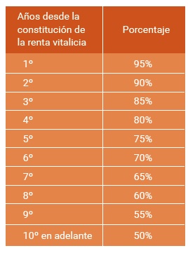 Por último, en el supuesto de fórmulas de contraseguro, la cuantía total a percibir con motivo del fallecimiento del asegurado no podrá exceder en ningún momento de unos determinados porcentajes respecto del importe destinado a la constitución de la renta vitalicia (ver tabla).