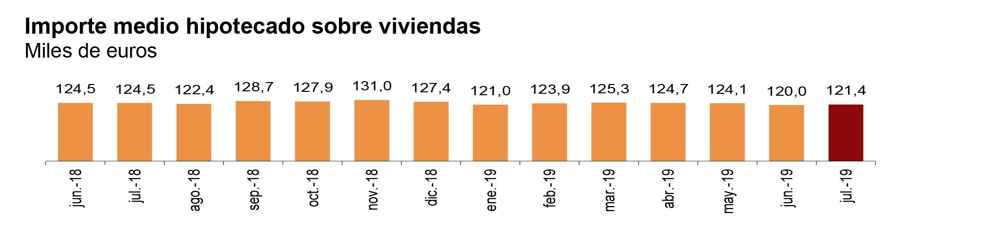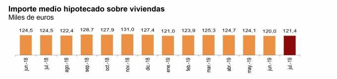 Para las hipotecas constituidas sobre el total de fincas, el tipo de interés medio al inicio es del 2,51% (1,2% menos que en julio de 2018), y el plazo medio de 23 años. El 58,1% de las hipotecas son a tipo de interés variable y el 41,9% a tipo fijo.